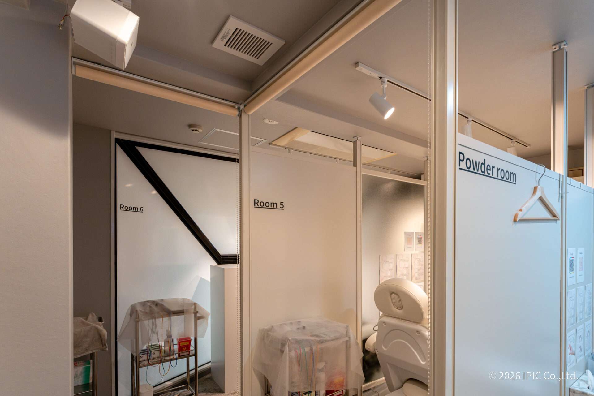 内装のベースカラーに合わせて、パーテーションのパネルからフレーム、ドアに至るまで全てをマットなホワイト、「シルキーホワイト」で統一しました。間仕切りを多く立てるとどうしても空間が狭く感じられがちですが、明るいカラーを採用することで圧迫感を軽減し、サロン全体に広がりと清潔感をもたらしています。