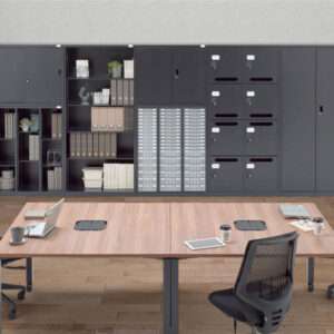 ブラック塗装を施したスチール書庫やロッカーは、指紋が目立ちにくい実用性を備えつつ、空間を引き締める壁のような一体感を演出します。
