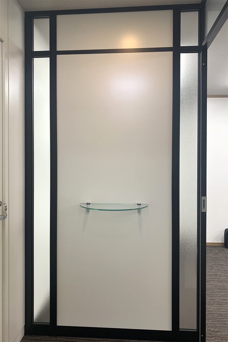 ― 造作壁ではなくパーテーションを選んでいただいたのは、スッキリしているからだったのでしょうか? 何か理由があったんですけど……何だったかな……。でも、やっぱり最後は人です。御社にお願いしたのは、担当さんの対応が良かったからです。 何社か他の業者さんにもご提案いただいて、パーテーションラボさんは2、 3社目に来ていただいたんですけど、「イメージが湧かない」と言ったら、担当さんが全部マスキングテープでその寸法で測って見せてくれたんです。そこで「これだとテーブル入るな」とやっとイメージがついたんですよね。