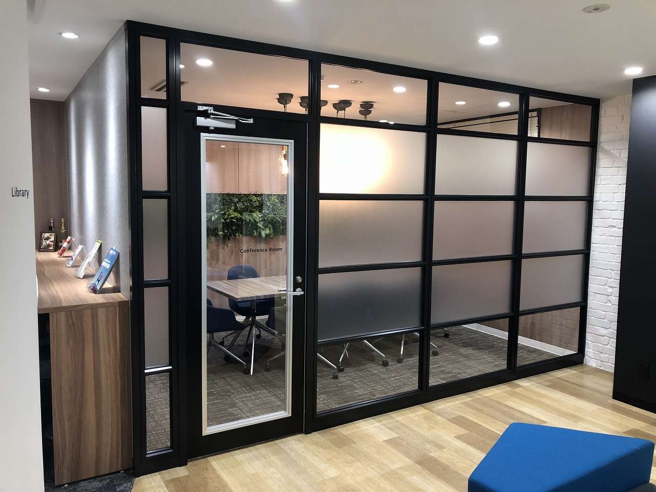 こちらは、施工型パーテーション「ブロックパネル」を使用した会議室の事例です。黒のフレームがシックで、上品な雰囲気を演出しています。