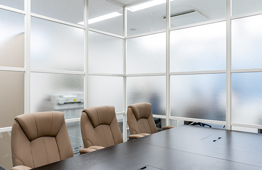 年劣化に強いホワイトベースのアルミフレームにクモリガラスを合わせた清潔感あふれる会議室。目線位置に曇りガラスを配すことで、機密性は保ちつつ、程よく外の雰囲気も感じられる空間に仕上げました。